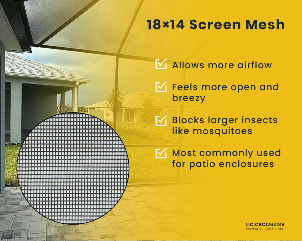 18×14 mesh is the most commonly used screen material for patio enclosures.