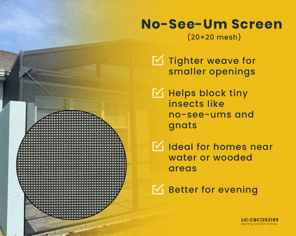 No-see-um screen, typically 20×20 mesh or tighter, is designed with smaller openings to block very small insects.