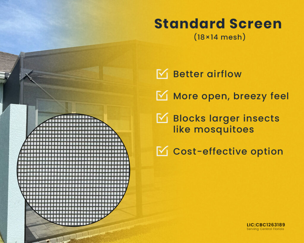 Standard screen, commonly referred to as 18×14 mesh, is the most widely used option for patio enclosures.